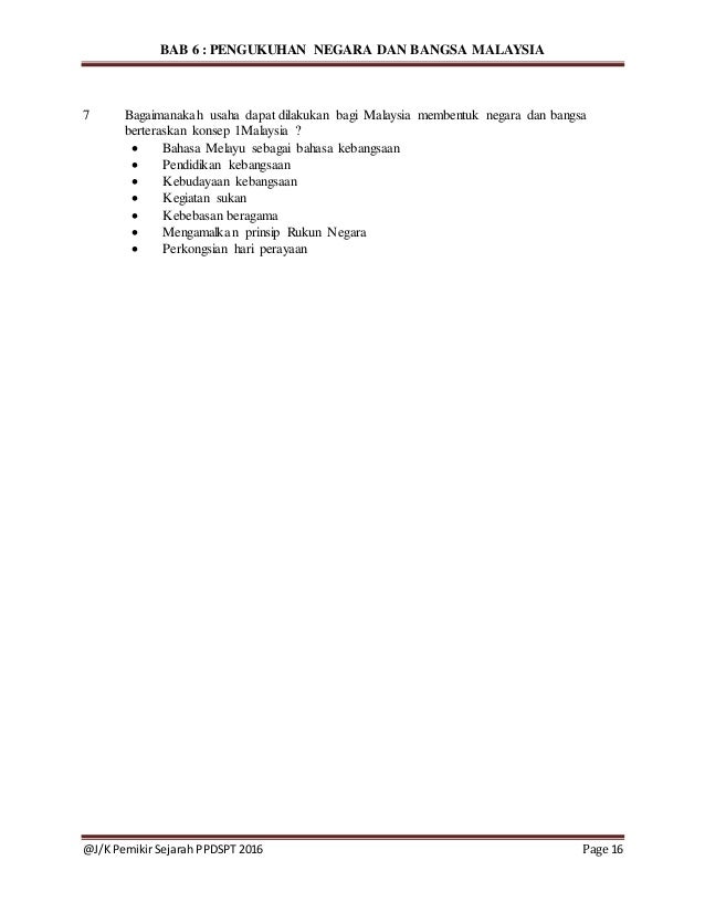 PENGUKUHAN NEGARA DAN BANGSA MALAYSIA 61 CADANGAN KE ARAH PEMBENTUKAN MALAYSIA ms 137 1. PENGUKUHAN NEGARA DAN BANGSA MALAYSIA JK Pemikir Sejarah PPDSPT 2016 Page 16 PERJANJIAN MALAYSIA 1963 4 Pada pendapat anda mengapakah Perjanjian Malaysia penting kepada negara kita.